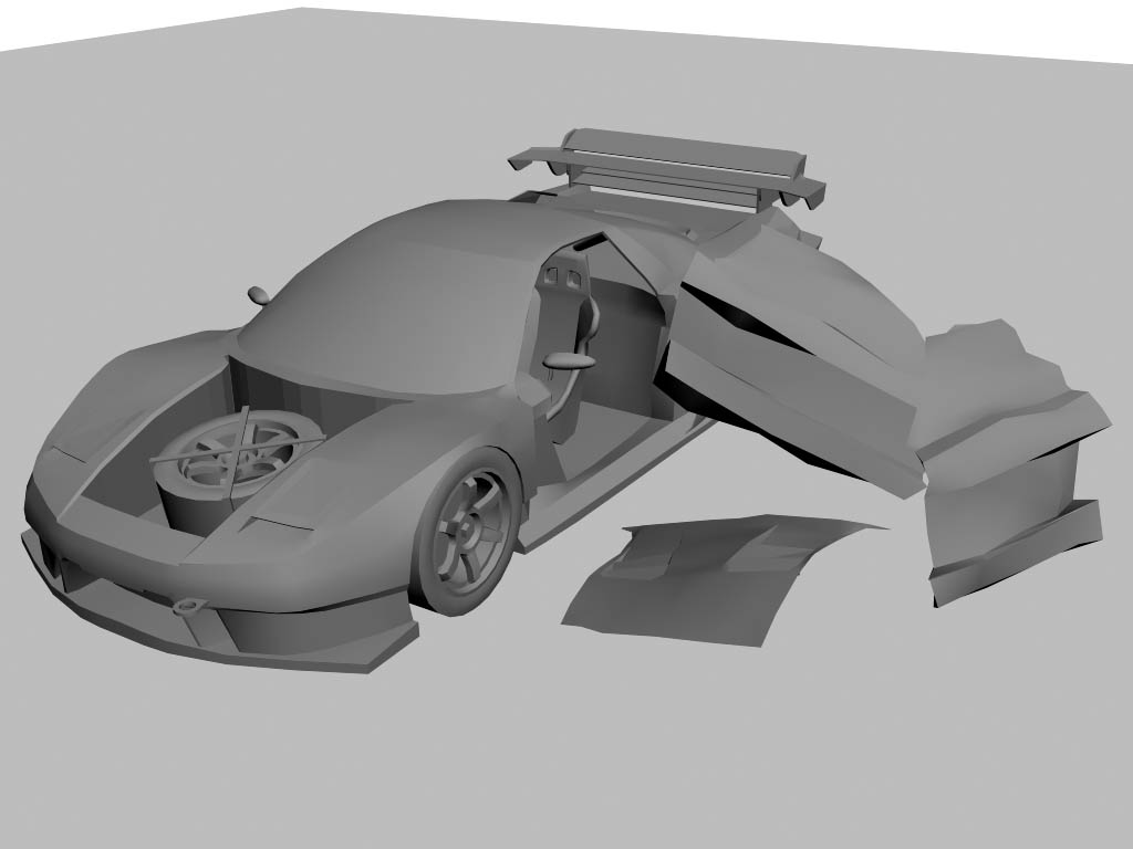 Also auch hier: Alle Teile die aufgehen oder abfallen sollen abtrennen und dann die entstandenen Löcher füllen (Kofferraum, Motor und eine Verkleidung für Karosserie zum Innenraum) und ab damit nach GTA Berlin
